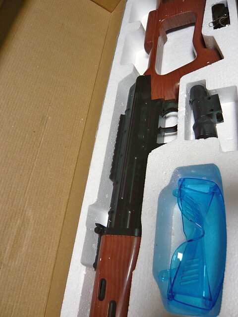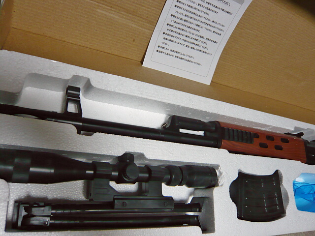 とにかく箱が長い!銃を分離せず全長そのままの箱なので1mくらいあります。実銃ドラグノフに対し1割ほど縮小されていますが、それでも長い長い銃です。