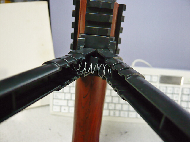 バイポッドは畳んだ状態からは一旦立ち上げて左右へバネのテンションで開いて展開します。畳む時は左右を束ねて折りたたみます。プラ製で剛性が無くフニャフニャしてますがロックはあるので使えなくは無いです。