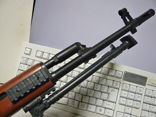 銃身付近。ちょっと長さ的に物足りないアウターで左右モナカ2パーツで全部繋がっています。ハンドガードの左右と下にレイルがあり、下のレイルにバイポッドを差し込みます。ロックもネジもありません。差し込むのは前からでも後ろからでも好みで。前から差し込むとバイポッドは後ろへ畳まれるのでハンドガードが持ちにくくなります。後ろから差し込んで前へ畳んだ方が都合が良いでしょう。