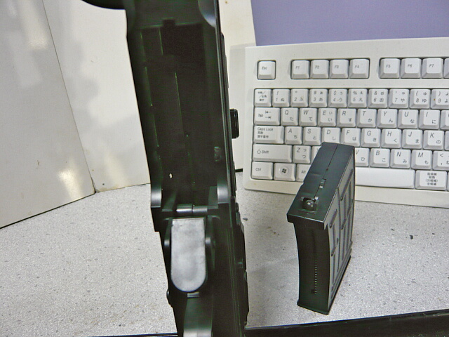 マガジンはリザーブ式。短いのでリザーブを殺す加工をすると装弾数が10発程度になりそう。銃への装着はマガジンの前側を引っ掛けて後ろ側をキャッチに掛けるAK系の動作を露骨に味わえます。前側の出っ張りがでかい。