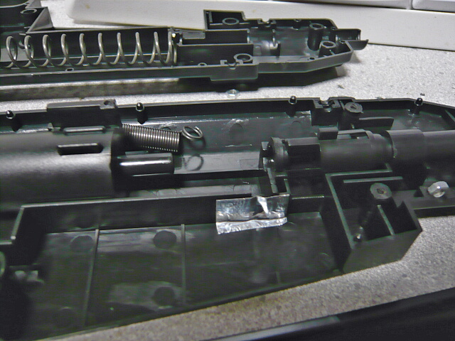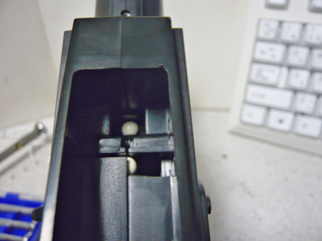 マガジンポート内の穴を塞いだのですが、全然効果無し。というかここはBB弾が通る幅がありませんでした。では何故機関部に弾が入るのか。