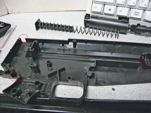基本的に無改造ではノズルの出入り口以外からはどうやっても弾は出て行きません。なのでノズルの出入り口の下に元々開いている穴を拡大し、他ではなるべく箱の隅になる位置に穴を開けます。この銃は機関部のほとんどを外殻が覆うので機関部に穴を開けただけでは外と繋がらないので上後端は外装にも穴を開けます。上画像の赤丸で示した位置に機関部のモナカ左側のみに弾が通れる穴を開けました。