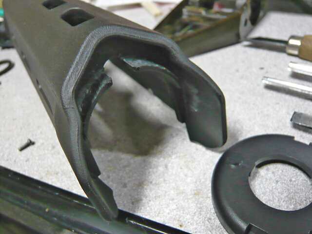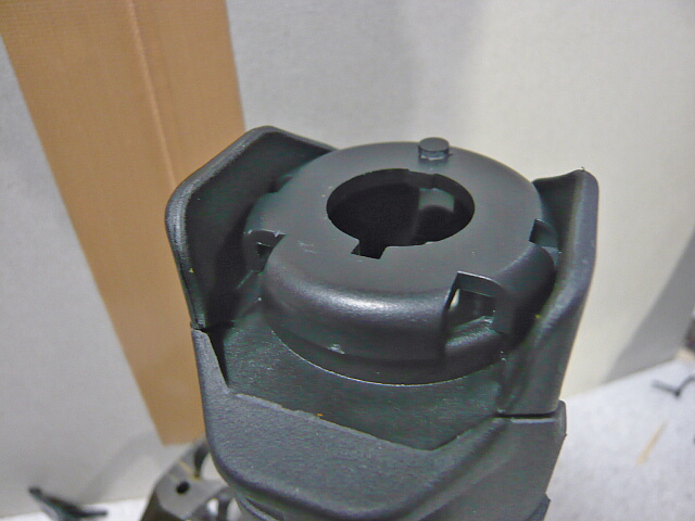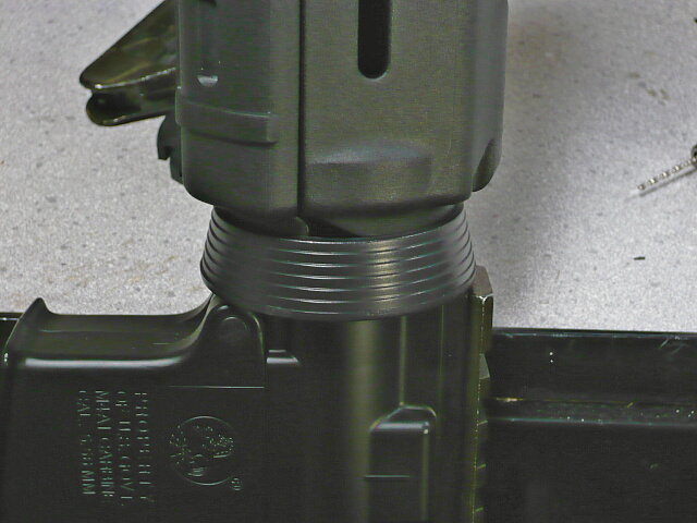 一旦デルタリングとスプリングを外し、その下にある傘状の部分をMOEハンドガード側にあるリブに合わせて切り抜き、ハンドガード下側の真下になる位置に銃側にある突起がはまる四角穴を開けます。現物合わせでちょっとずつ削り調整してゆき、噛み合うようになったらハンドガードのデルタリングが被さる部分の外側を薄く削ります。