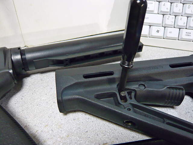 取り回しを良くするため、一旦MOEカービンストックも抜きます。上画像のようにピンの上にプラスドライバーを差し込んでレバーを握ればストックが抜ける位置まで動かす事ができます。さようなら爪楊枝。