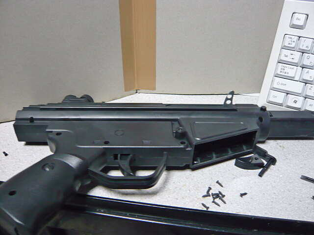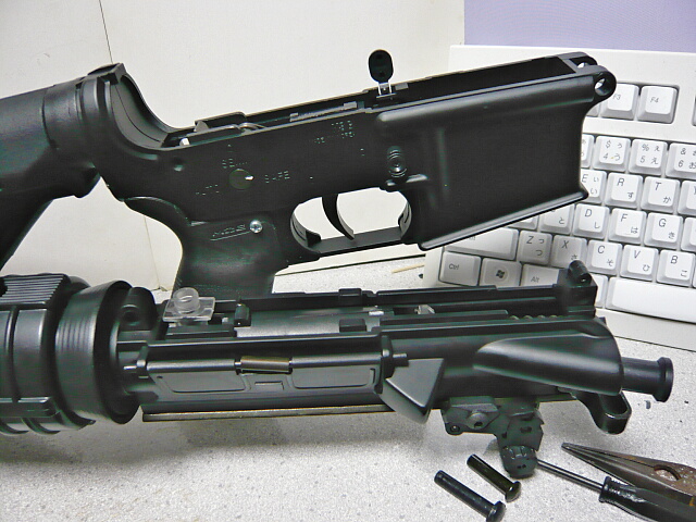 マガジンポートの内側を削るため一旦レシーバーを上下に分割します。後ろ側のテイクダウンピンは金属製ですが前側はプラ製です。ピンの頭じゃない方から力いっぱい押せば抜けるはずです。この辺りは長物エアコキとしては抜群の整備性です。ここから更にバラすのは大変そうですが・・・