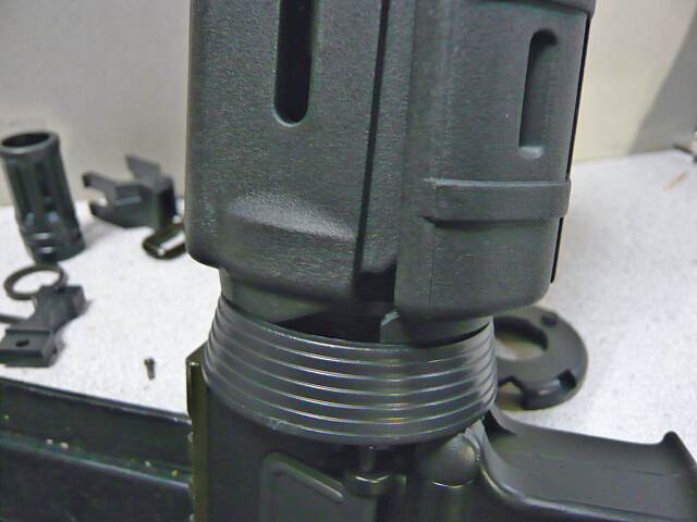 でも色々試行錯誤しているとだんだん光明が見えてきます。ハンドガードを挟むバレル付け根デルタリングの下はリブが邪魔をしてるだけでちょっと削るだけでいけるように見えます。