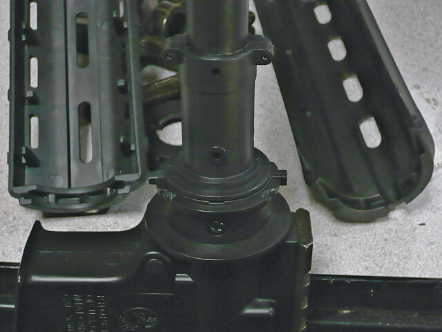 アウターバレル前半は後半部分に締まりなく差し込まれているだけ。バリエーションに短小モデルのL85AFVがあるのでこの辺はレシーバーとはちゃんと別部品になっています。
