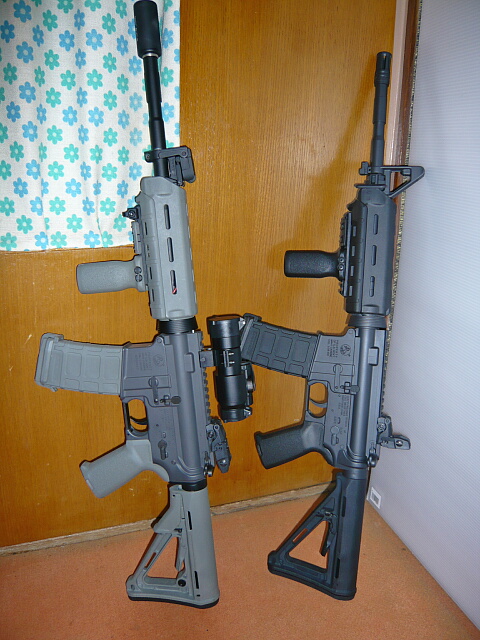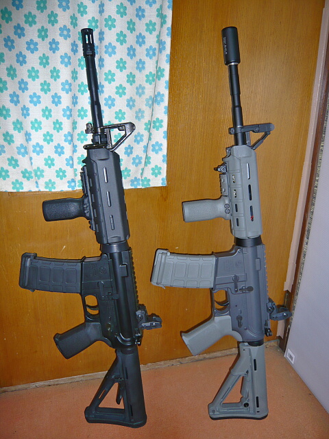 MOEMOEツーショット。マルイのM4レシーバーに較べると全然黒々しています・・・