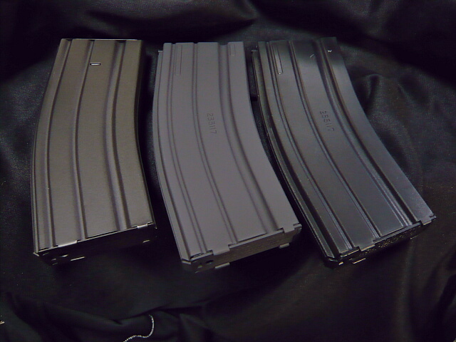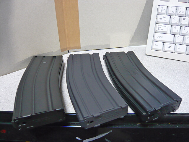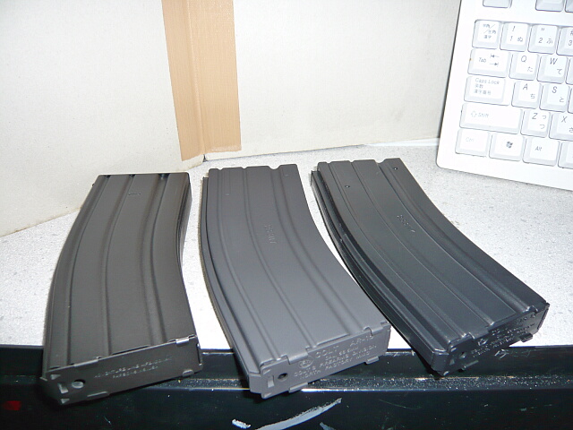 トイスターのM4マガジンを早速塗装してみました。左からマルイ電動M4ノーマルマガジン、パーカーシールで塗装したトイスターM4マガジン、無塗装トイスターM4マガジン。