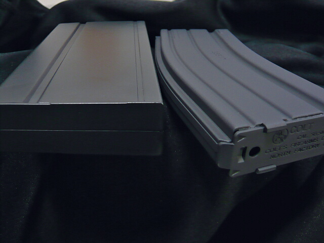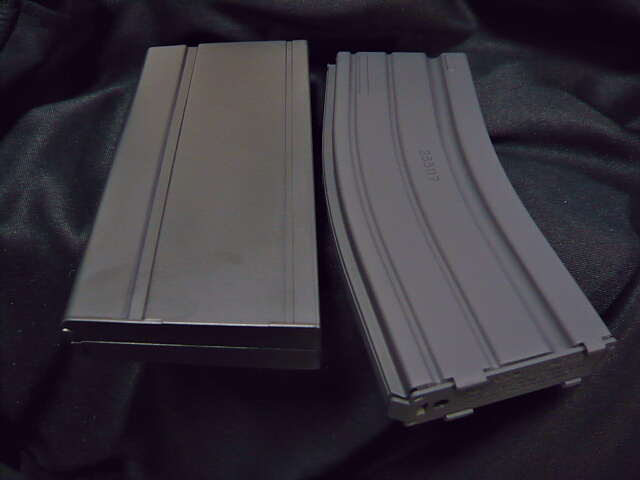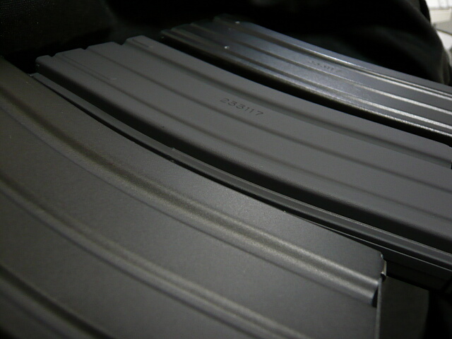 キャロムのブラックスチールで塗装した中華M14のマガジンと。目で見る感じは同じくらいのグレー加減。差は表面の光沢と混入している金属粒子の存在感くらい。