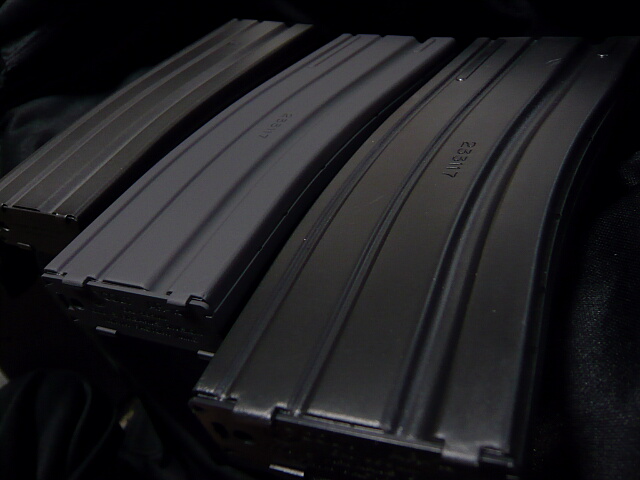 背景色を変えて色々な角度で。マルイ電動M4ノーマルマガジンは半光沢の黒鉄色、トイスターM4マガジンは真っ黒成形色で表面がつや消し風の細かいシボになっています。