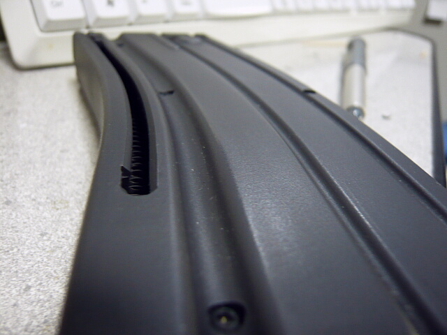 マガジンポート内部。前後左右ともマガジンに対しタイトで、特に後ろ側(上画像の右側)の段になってるところの幅が狭いのがマガジンの互換性を失わせています。