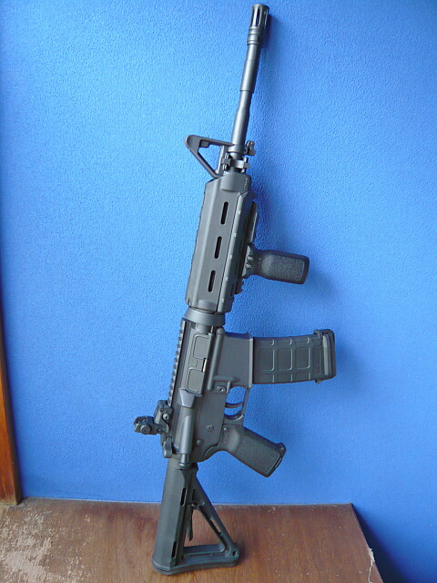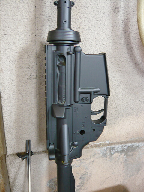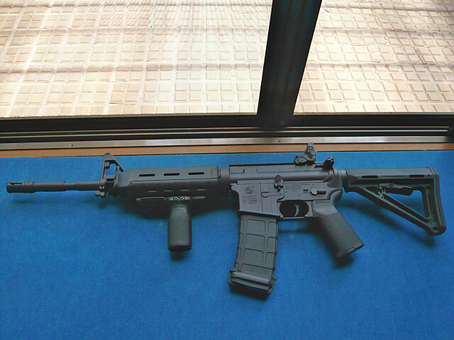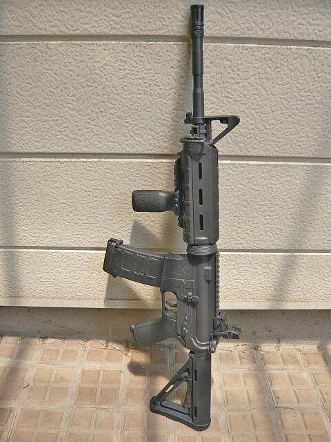 ノーマル状態のM4のように樹脂パーツがツヤのある黒だったらメリハリが付いて良いのでしょうが・・・なぜMagpulタイプの金属レシーバーが真っ黒塗装で売られているのか理解できた気がします。