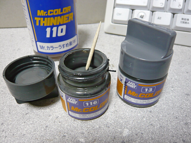 さて塗装にかかるのですがガンカラーはパーカー塗料のグレーさ不足に幻滅したばかりなのでプラカラー。スプレーなんてものは無いので適当にありあわせの材料。Mr.カラーの116 RLM66ブラックグレーに13ニュートラルグレーを10~15%程度混ぜました。元のブラックグレーだけだと暗い気がしたので・・・