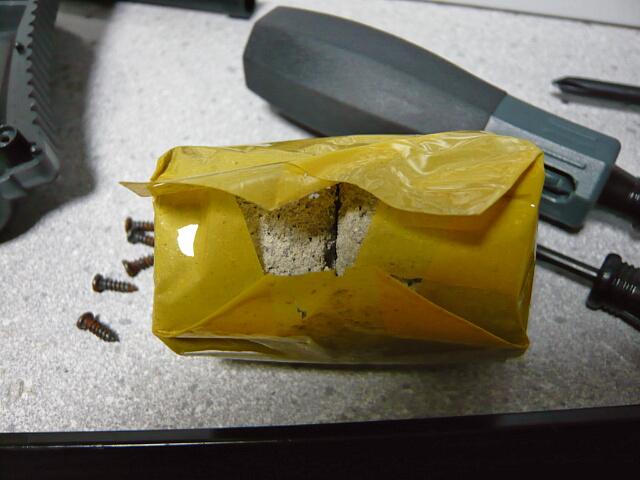 重りの包みを開いてみると中にはモルタルのようなカタマリが2つ。重りとしては簡単ながらちょっと軽いブツです。事務用のテープカッターは中に重りとしてコンクリートや石膏が入っていますがあんなのよりも砂粒がでかくてワイルドな感じ。