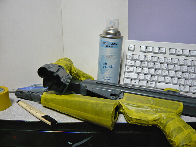 期待したほどグレーじゃなかったしこれ以上明るいパーカー塗料も無いので諦めてトイスターM4の塗装にかかります。ハンドガードやグリップ、ストックをはずして塗装するものだけを残した状態で組んでブラックスチールを吹きつけ。ストックチューブを掴んで吹き付けているので作業性が良いです。