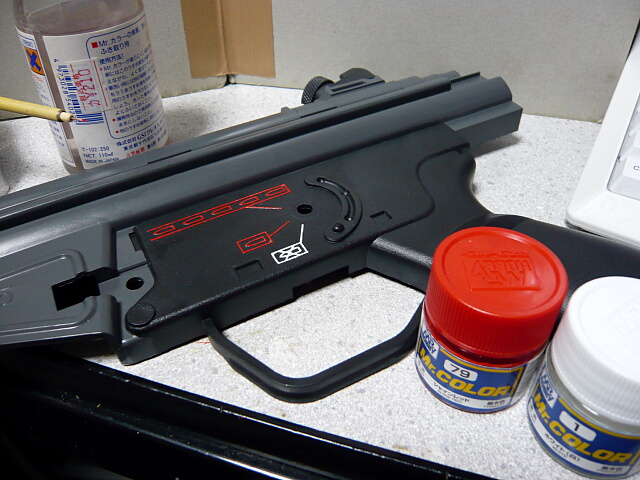 レシーバー左側にはアイコンが凸モールドで表現されているのでシャインレッドと白でそーっとそーっと凸モールドの頂上面を塗ります。グレーと黒のツートンに赤白が映えます。