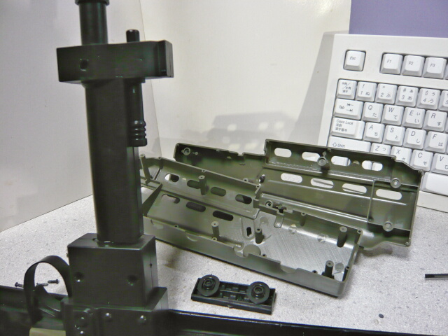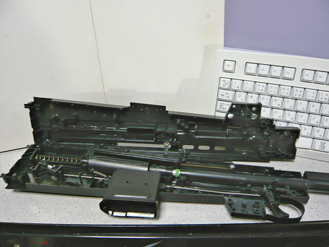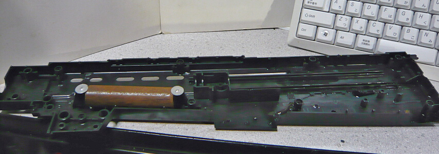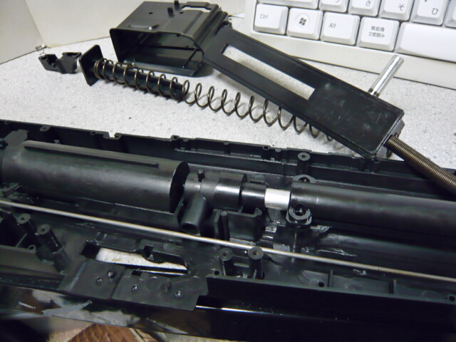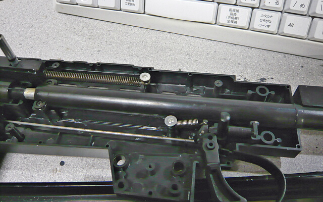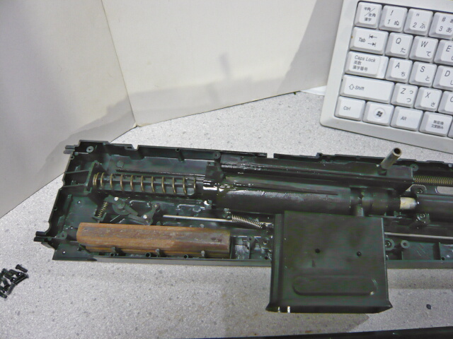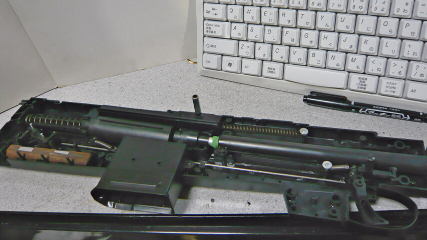 左半分にはメカ一式が載っています。まずギトギトにグリスまみれなのにゲンナリ。レシーバー後部には錆鉄棒が2本入っていますが、これが微妙に太いためにその下に隙間が開いていたようです。