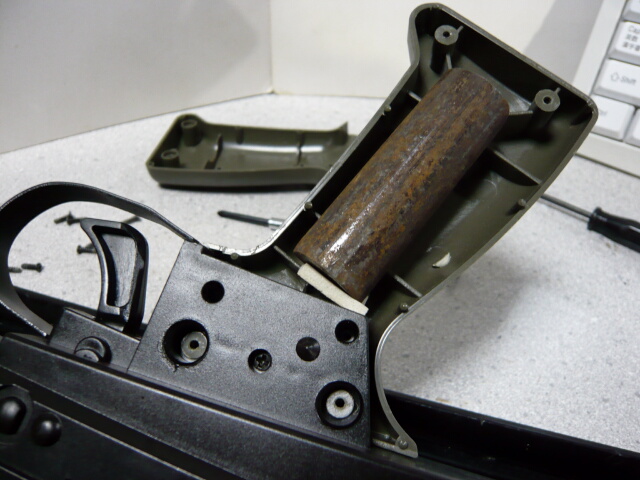 グリップ右側のネジ4本を抜くとグリップが左右に分かれます。中にはまた錆鉄棒。