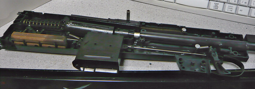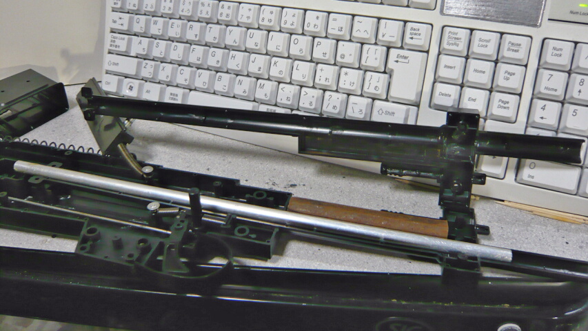 レシーバー前半。インナーバレルはアルミ製のものが入っています。アウターバレルは付け根で上下にネジ留めされてるだけ。トリガーには針金状のリンクがあり、レシーバー後方まで長~くのびています。