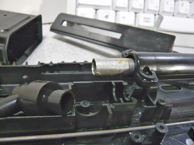 チャンバーは単純なT字通路で、ホップアップ機構はありません。チャンバーゴムはチャンバー内にはまっていますが、やはり油まみれ。インナーバレルはアルミ製ですが内径が結構大きい気がします。油まみれにして強引に動作させているような、前々時代的な思想でしょうか。