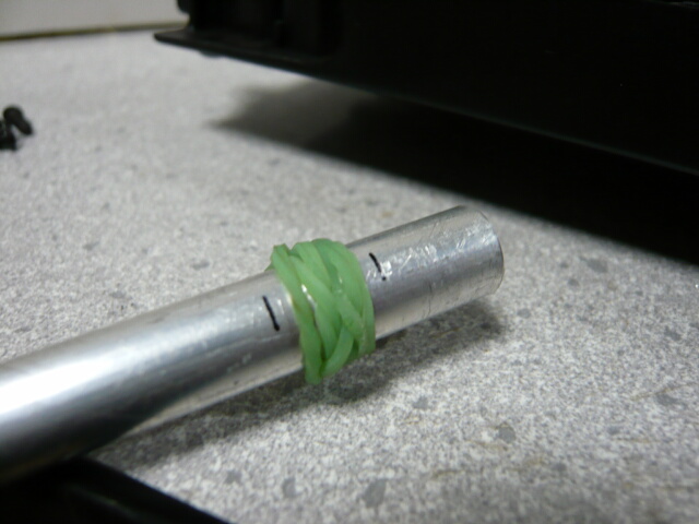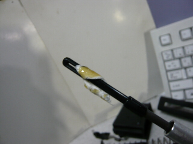 これだけでお手軽ホップアップバレルの完成。ホップアップとは発射されるBB弾にバックスピンをかけて弾を空力的に浮き上がらせて飛距離を伸ばすもの。バックスピンをかけるにはチャンバーのすぐ先の上面にゴムの引っ掛かりをつけてやればいいのです。これだけでノンホップ時代の銃の飛距離が10m以上伸びるので昔よくやったお手軽改造です。