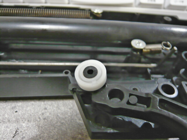 このリンクが刺さる部分にスリーブでも被せられれば・・・とこの部分の径に見覚えが。そうそうコレコレ。タミヤの安いRCカーに付いてるプラベアリング。あつらえたようにピッタリはまります。周りに干渉する部分を切り飛ばして組み付け、モナカを閉めてコッキング!