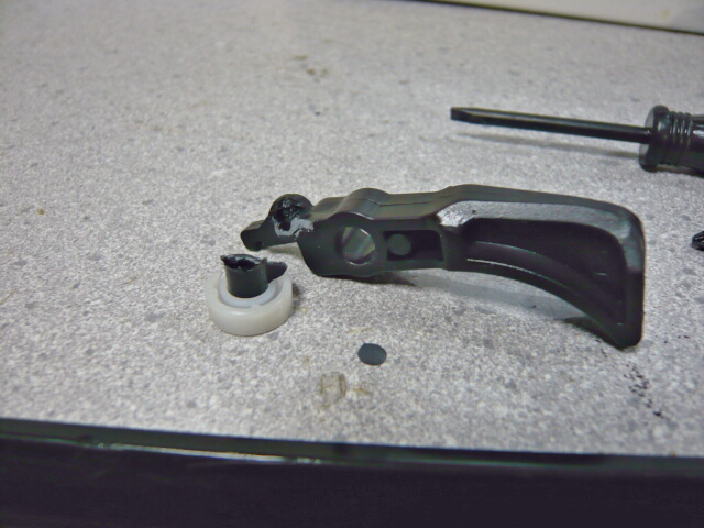 トリガー周りをチェックすると、トリガーの上のリンクが刺さる部分が割れていました。おいおいコレどうしろっつーの・・・