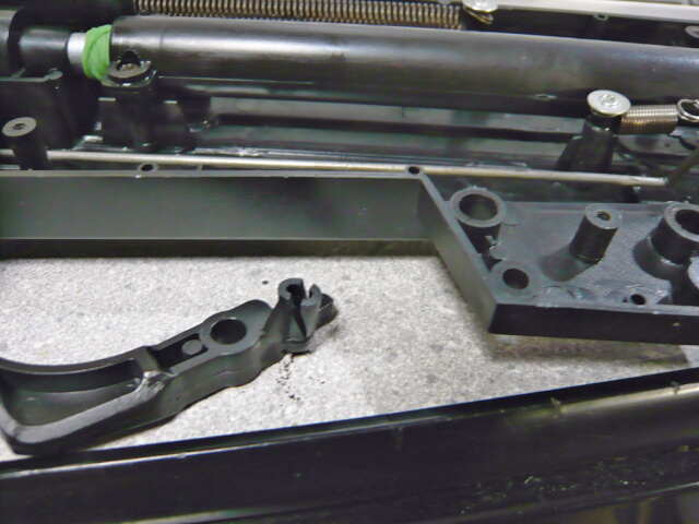 トリガーの動きに対しリンクの動作量が足りない・・・という事は途中で一旦リンクを分割し、長さの違うシーソーをつけて少ないトリガーの動きを増幅させてやったらどうか?ちょうどそれを組み込むスペースは十分にあります。問題はトリガーに掛かる負担が増える事になるのでもう折れかけてるトリガーが耐えられないのでは・・・という点と、シーソーをどっから調達するか?