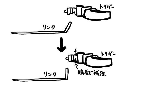 まずリンクが上図のように曲がっているのをきっちり90度に直し、折れかけてるトリガーを瞬着で補強。