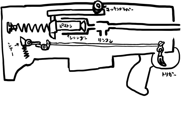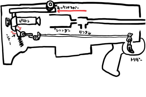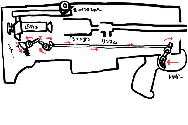 トリガーを引くとリンクを介しシアーが引き下げられてピストンの爪との引っ掛かりが開放され、ピストンはバネの力で前進します。