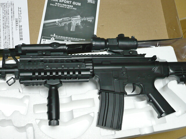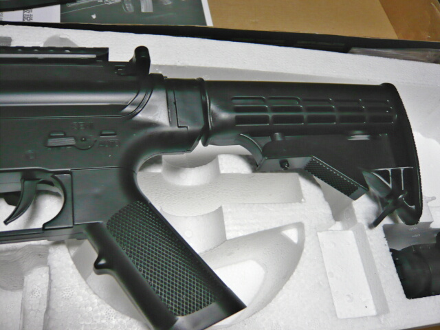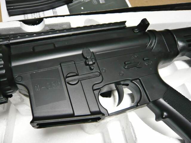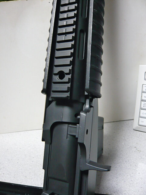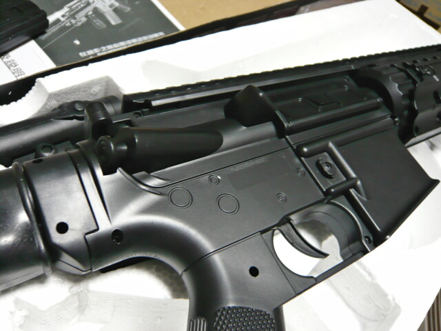 安いトイガンとはいえレシーバー上にはちゃんとアッパーレイルがあり、その上にRASが被さっています。RASの中に覗くアウターバレルはちょっと太いですが、安いなりに頑張ってるところも所々に見えます。M4系の首(レシーバーとハンドガードの間)の弱さはこの銃からはあまり感じられません。ハイダー辺りを掴んでゆするとフロントサイトポストより前のアウターバレルだけがたわむ感じ。結構ラフな扱いにも耐えるかもしれません。