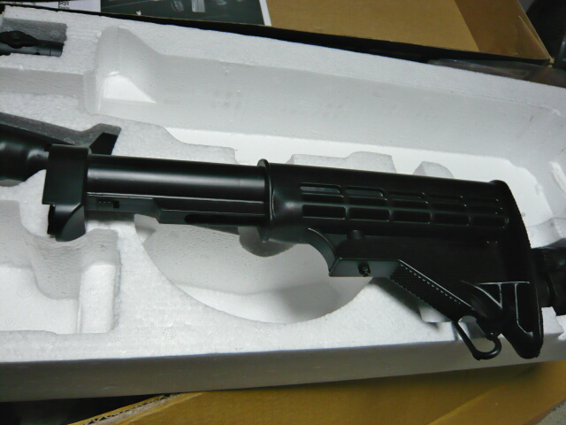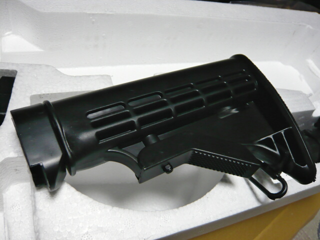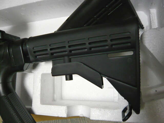 別体で付属するブッシュマスタータイプのスライディングストック。M4A1後期のストックですね。バットプレート周囲にバリが多かったりスリングスイベルがブラブラしてたりレバーのナットが小さかったりしますが雰囲気は出ています。