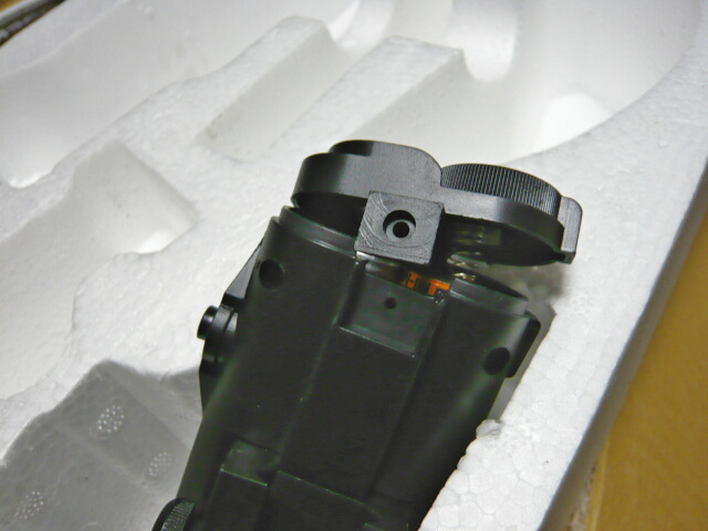 下側はレイルへの取り付け金具があります。手で回せるネジですがボルトとプラ製のダイヤルが分離しがちなのでウザいと思ったら瞬着で固めて分離しないようにすると良いでしょう。
