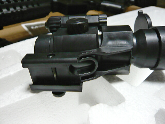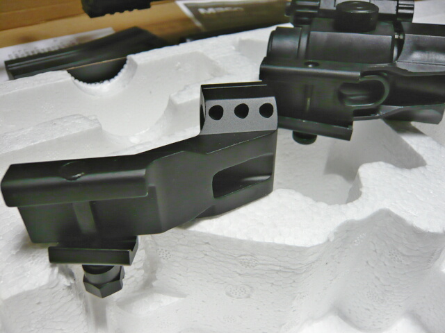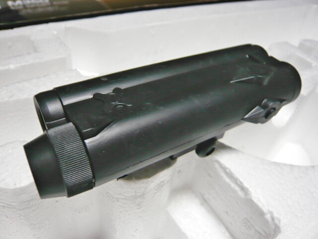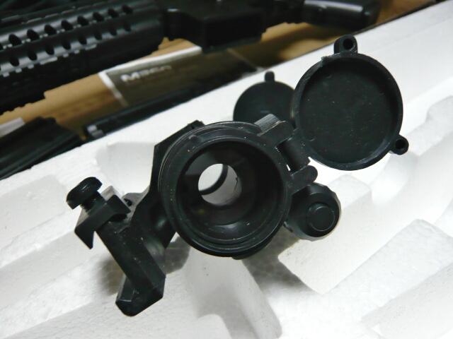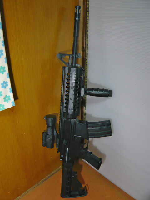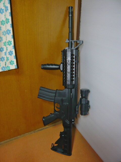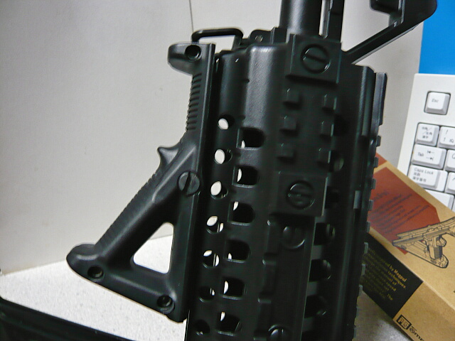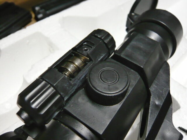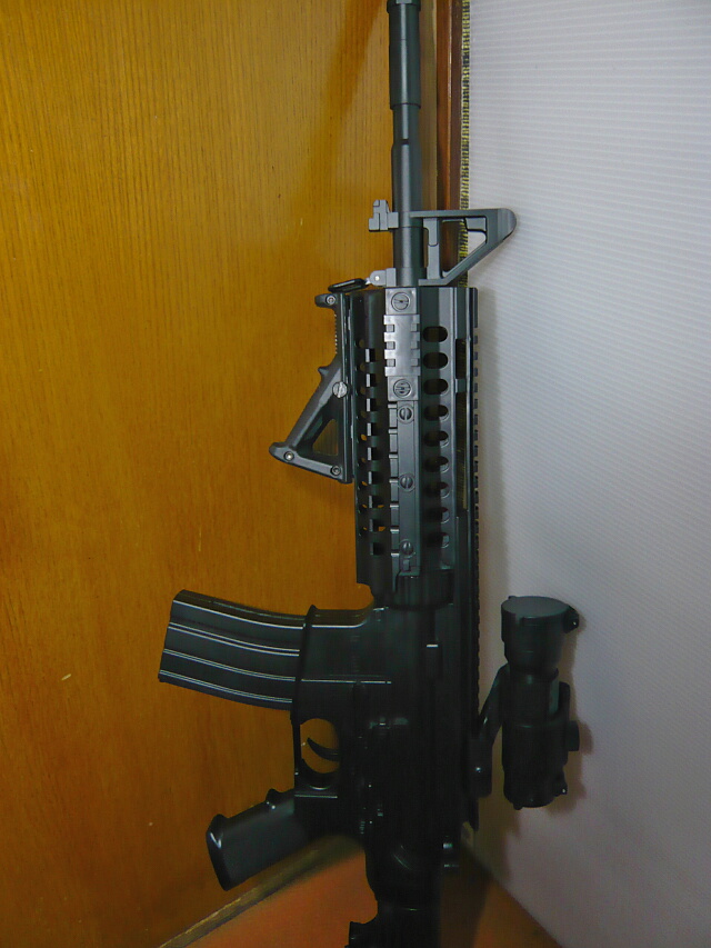 全部乗せ。リヤサイトが無いのでドットサイトは要るし、フォアグリップは便利。ライトはサイティングの邪魔にしかなっていません。マルイの電動M4s-systemみたいに可倒式の前後サイトだったら・・・というのはこの銃には求めすぎか。アレと同じタイプのSPRフロントサイトは持っていますが、この銃のフロントサイトポストは残念ながらアウターバレルと一体になっています。