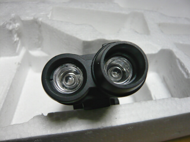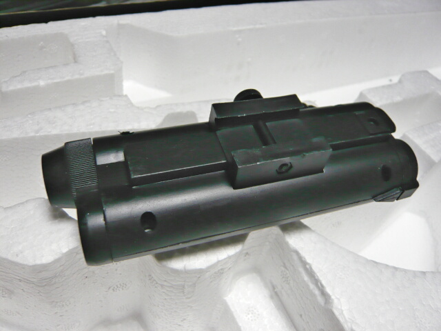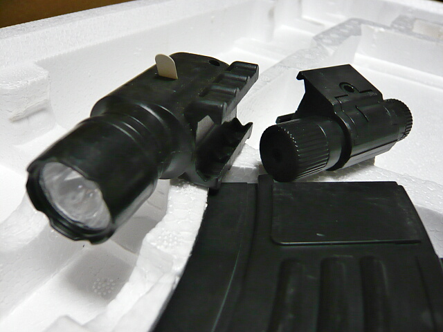 左右のレイルに取り付けるためのライトとレーザーサイトもどき。ライトは絶縁シートが出ているのを見ればわかるように、一応LR44電池がすでに入っています。レーザーサイトもどきはスイッチもあり電池ボックスもありますが中身は空っぽ。