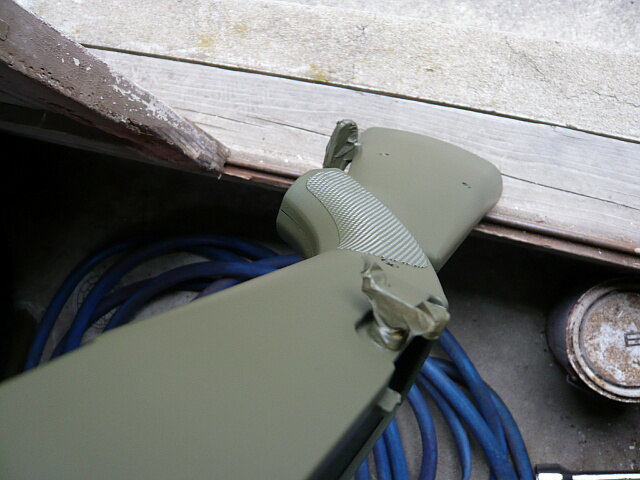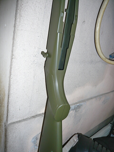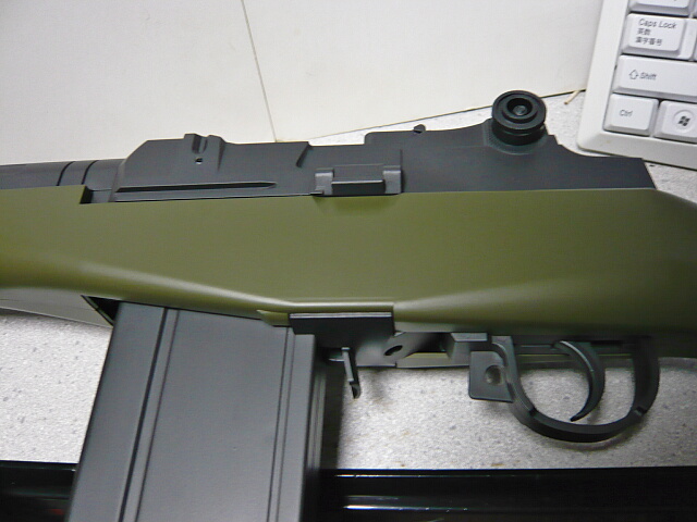 次は銃床。前方にあるアンダーレイルと後端のバットプレートこそ外しましたがセレクターレバーと後ろ側のスリングスイベルは外すのが面倒なのでマスキング。こちらも脱脂をしてオリーブドラブを吹きます。インディの塗料は初めて使いましたが最初はちょっと塗料のダマが撥ねる時があり、大丈夫かコレと思ったもののしばらく吹いてゆくと安定した噴霧になります。フシュンフシュンとちょっと音も特徴的。一気に厚塗りすると半光沢になるようなのでちょっとつやがあるな、というところへはフワリフワリと吹いてやるとつや消しにできます。こちらも乾燥が速く作業性が良いです。色は思ったより明るい感じがしますが、大体一般的なオリーブドラブのイメージどおりの発色かと思います。
