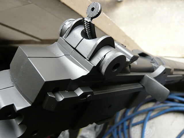 リヤサイトはタンジェントサイト。ここはちゃんと可動します。左側のボタンを押しながら前後させると上下に調整できますが、まあトイガンですんであんまり調整する意味はありません。右側面のレバーはハンドガード上半分を外すためのレバーですがここはただのモールド。