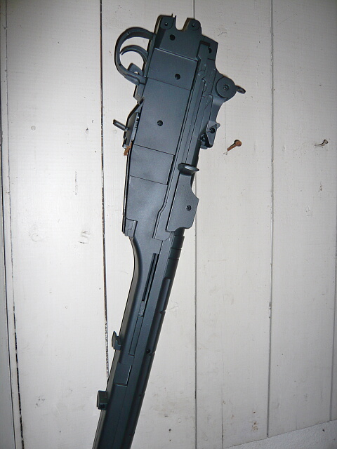 ストックの結合はレシーバー後端に上からはめ込むとラッチでロックされます。一杯までさした後ストックの付け根を上から引っ叩いてやるとカッチリとロック。レシーバー左にあるスリングスイベルはモールド。この銃はほとんどの部分がモールドで処理されておりあまり可動部分はありません。