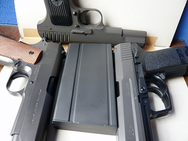 思ったより黒いのでマガジンは一旦チタニウムシルバーを薄めに吹いてからブラックスチールを吹きました。・・・あんまり変わりませんでした。色具合の比較として成形色でパーカー調になっているエアコキハンドガンで囲んでみました。上がトイスタートカレフ(パーカー)、左がマルイのHGミリガバ、右がマルイUSP。ミリガバよりやや黒いくらいのダークグレーさですがミリガバよりは青い感じ。