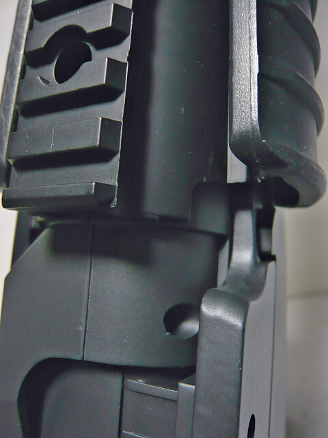 ハンドガードは上下一体で、穴は左右に抜けているだけで奥をのぞくと黒いトンネルになっています。ハンドガード左右には取ってつけたようなレイルがあります。横にあってもな・・・