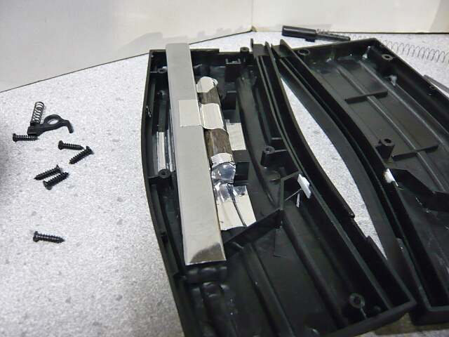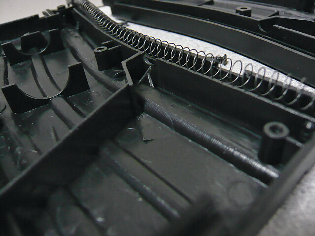 マガジンにウェイトを配置する際切り飛ばした破片を適当な大きさに刻んでマガジンキャッチ左側のこの位置に接着。根本的な解決にはならないのですが、マガジンを挿した時ここを押せば確実にキャッチが掛かります。掛かりが悪いのはキャッチのストローク不足と左側のパーツに剛性が足りないのが原因。