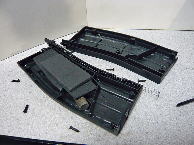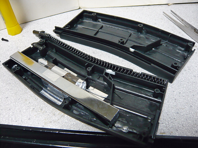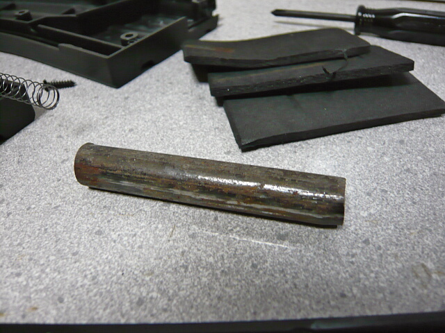 軽いのでウェイト無しかと思ったら一応入っていました。中華製トイガンでは定番の錆びたクズ鉄の棒。これをウレタンシート3枚で雑に突っ込んで左右モナカで挟んでいます。軽いのは単純にウェイトが小さいからか。