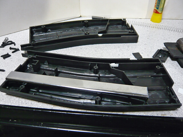 左右モナカ構造でネジを外して左右分割すると上画像右下のフィンガーチャンネルの無いパーツと交換することで握り心地を若干変える事ができます。銃のレイルへは端から差し込んでスライドさせ任意の位置でネジを挿して留め固定します。レイルへの差込みはちょっとタイトでキツめ。レプリカゆえか結構バリも残っています。