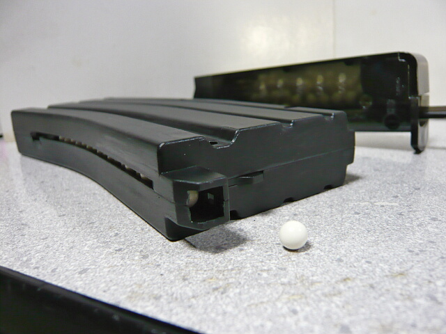 今時の普通のマガジンのように上側からBBローダーで普通に給弾できるようになりました。リップの後ろ側のストッパーの位置関係により弾1個分引っ込んだ位置が最大量となります。この給弾方法に絞るなら下側のフォロワーストッパーもいらないので勝手にロックされるのが心配ならプラ板でも貼って埋めても良いでしょう。ただしフォロワーの指を掛ける部分は切り飛ばすとBB弾と一緒にフォロワーも出て行ってしまうので残しておかないと困ります。残弾確認用にスリットは残しておいた方が便利でしょうか。