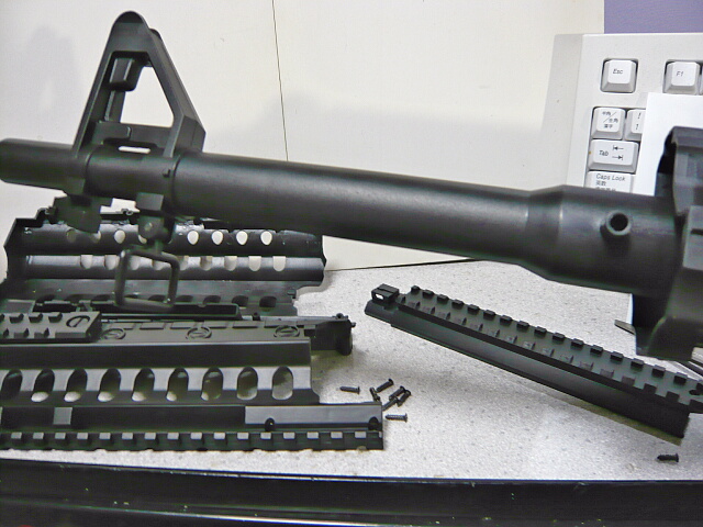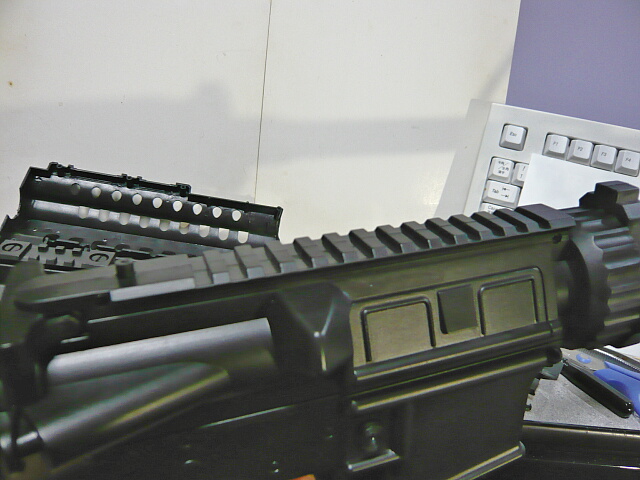 ついでなのでRASを外して様子を見てみました。RASの右側面にあるネジを7本、アッパーレシーバー上に掛かっているレイルの後端の1本を抜くと外す事ができます。