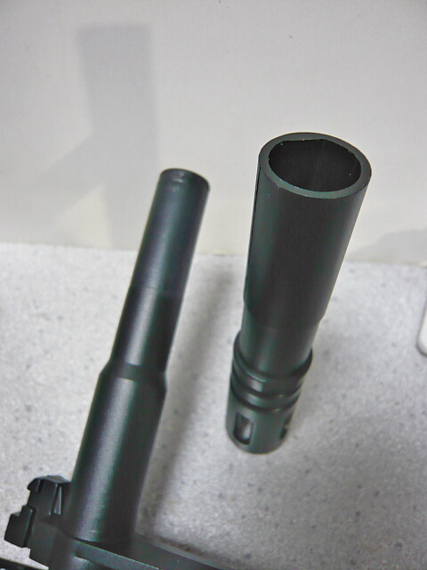 アウターバレルは一段細くなり再び太くなっているところから先が別パーツ。D断面になっていて位置が決まっています。D断面が始まっている位置(上画像左のアウターバレルが擦れてツヤが無い部分の下端)までインナーバレルがあります。