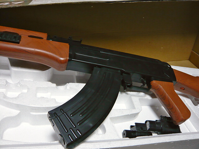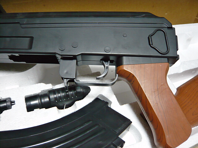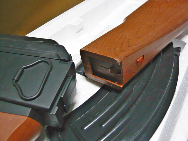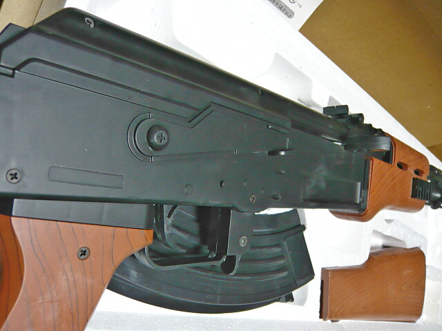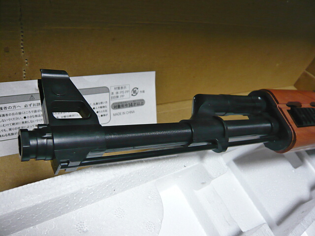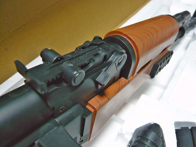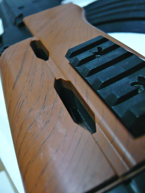レシーバー左側面。プラスチック然としているのは仕方ないとして、全体がつや消し処理されていてエッジも立っています。AK47という銃のイメージからすると、もっとダルくてもいいような。まあダレさせるのは後加工で造作も無くできるのでユーザーが好みで手を加えると良いでしょう。手を加えると愛着もわきます。