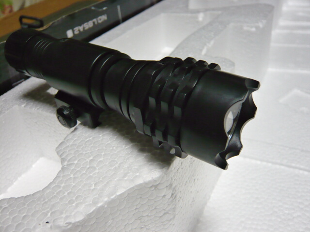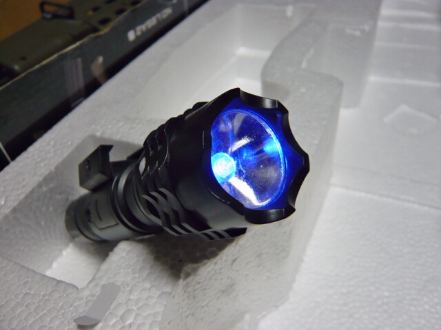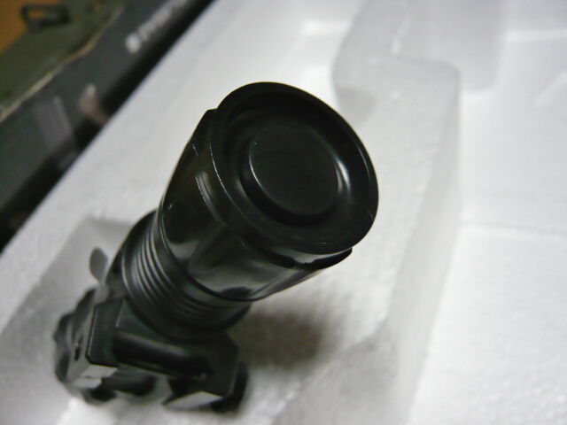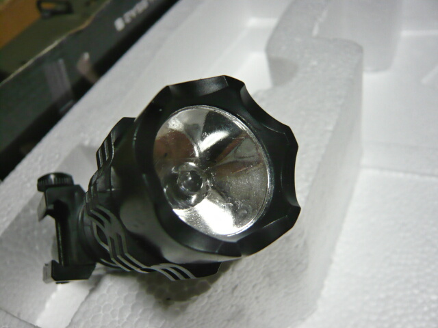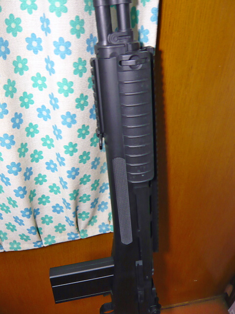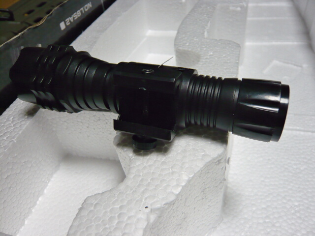 ライト装着。ハンドガードを持つ手に対し非常に邪魔な印象。この位置のレイルにはフォアグリップの方が有用でしょうか。
