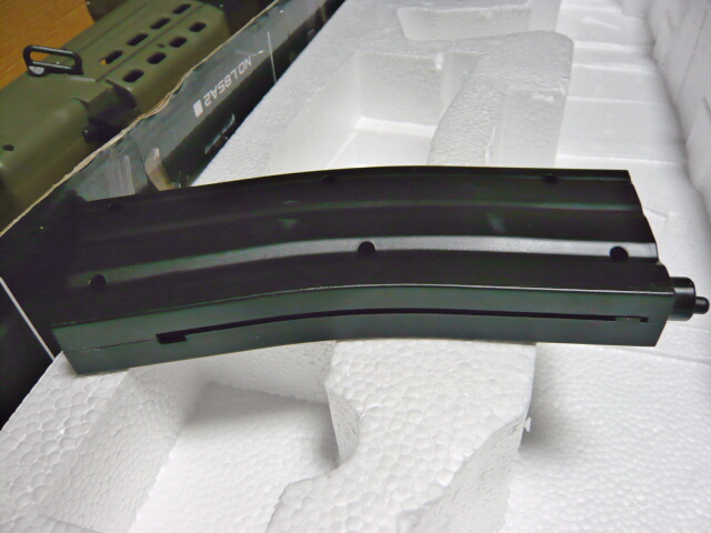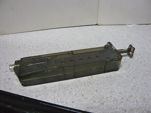 マガジンはこの大きさで37発。上面の片側に開きそうなフタがありますがリザーブだと思ってスライドさせようと無理にこじ開けたら折れます(折りました)。中はただU字になってるだけで空いたところには錆びた鉄棒が入っています。